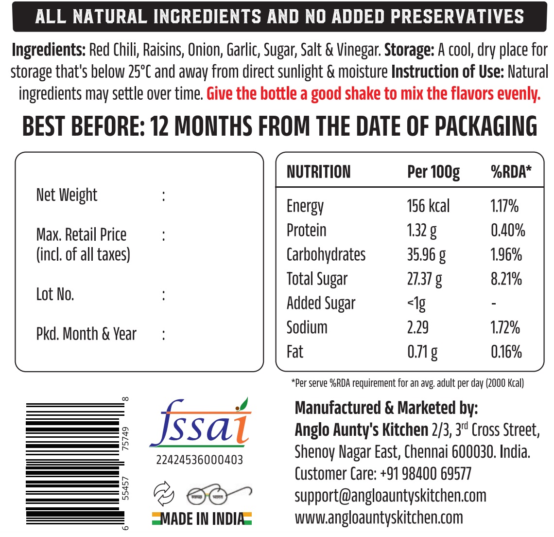 All natural ingrdients and no added preservatives (Red Chilli, Raisins, Onion, Garlic, Sugar, Salt & Vinegar).